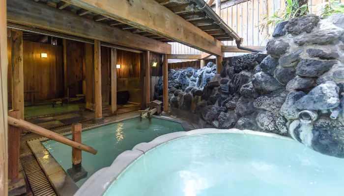 酸性のお湯は少しピリピリするような肌触りが特徴。殺菌効果やピーリング効果があり、肌の表面にある古い角質を柔らかくして溶かしてくれます。また、体の新陳代謝も促してくれるので、昔から慢性的な皮膚病などの治療にも使われてきました。入浴後は肌がツルツルになりますが、肌の弱い人には効きすぎる場合もあるので、入浴後に真湯でしっかり洗い流しましょう。