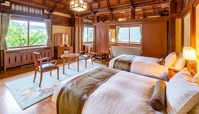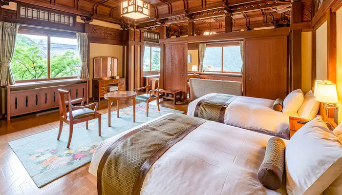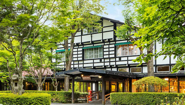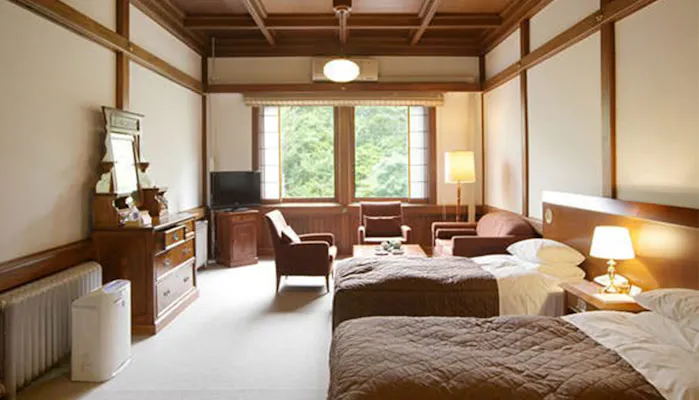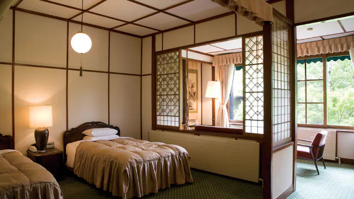 ホテルには築年数や趣が異なる館が5つと、ファミリーの宿泊に便利なコテージも。なかでも1936年(昭和11年)築のアルプス館には、床の間を配した和と洋が調和するクラシックツインルームを完備。磨りガラスの照明や格子戸、網代壁などからクラッシックホテルの醍醐味を感じられるでしょう。また、館内の史料室には常連だったジョン・レノンが弾いたピアノや、田中角栄とヘンリー・キッシンジャーが会談の際に座った椅子など、貴重な展示も。館内の至る所でホテルの歴史や伝統が垣間見えます。