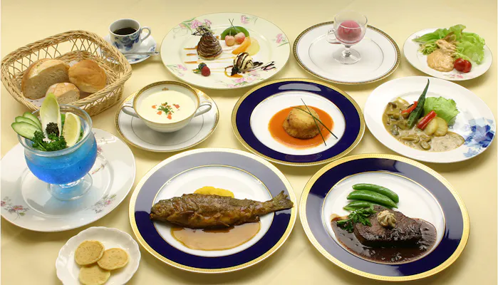 本館2階に位置する 「メインダイニングルーム」は、明治時代にホテルのロビーだった場所を改装して造られました。柱頭彫刻や明治時代の装飾品で彩られた格調高い空間でいただけるのは、歴代の料理長から受け継がれてきた伝統のフランス料理。「虹鱒のソテー金谷風」や「大正コロッケット」など100 年以上続くメニューを、味わってみては。