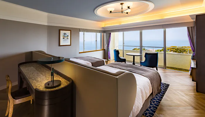 伝統を守りながらも、進化し続けている「川奈ホテル」。昭和 初期の近代建築の魅力はそのままに、滞在価値の高い空間造りを目指し、非日常と特別感を感じられるような改装を実施。例えば、74.6平米のゆったりとした造りの 新本館客室「オーシャンビュースイート【禁煙】」。ブルーを基調としたお部屋の目の前には相模灘が広がり、四季折々に表情を変える前庭の景色を楽しめます。他にもトランドルベッドを導入した「オーシャンビュースーペリアカルテット【禁煙】」など、滞在に合わせて客室を選ぶことが可能です。