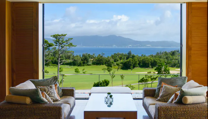 滞在の始まりは、エントランスから続くロビーラウンジでの休息から。高い天井の開放的な空間は、「かねひで喜瀬カントリークラブ」のグリーン越しに、沖縄本島一美しいといわれる名護湾が眼下に広がります。