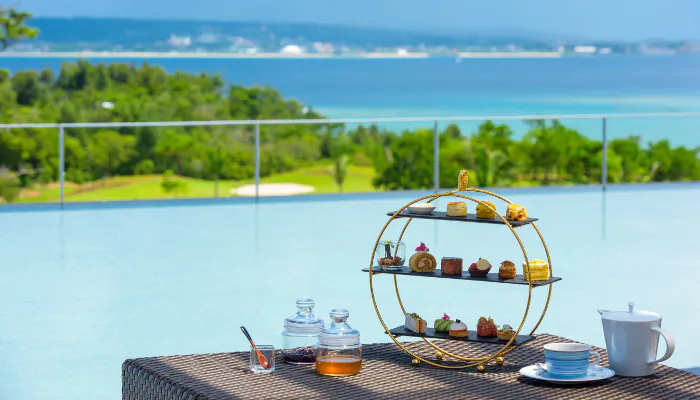 沖縄県産の食材を使ったパティシエ自慢のスイーツやフィンガーフード、泡盛を使ったカクテルからこだわりのコーヒー・紅茶まで、バラエティに富んだメニューが用意されています。テラス席では、東シナ海の雄大で幻想的なサンセットを見ながらゆったりと過ごすのも素敵ですね。夕暮れ時の景色に包まれ、沖縄の風を受けながら、特別なひとときを過ごせることでしょう。