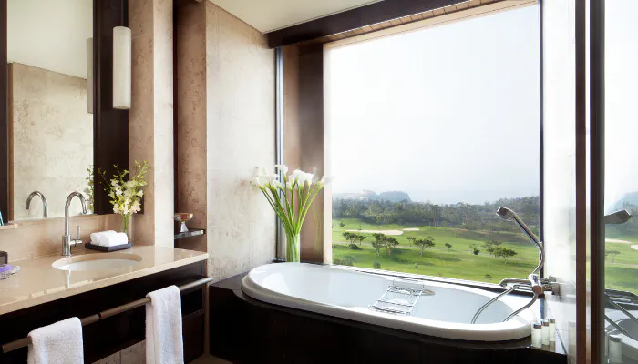 ラグジュアリーさを際立たせているのが、窓際に悠然と備わるビューバス。ダブルシンクの洗面台と、シャワーブースはハンドシャワーとレインシャワーを完備しています。アメニティはアスプレイ社のパープルウォーターのプロダクトに加え、ブラシ・バスソルト・ヘチマスポンジなど。リネン類やガウン、スリッパなど肌に触れるものは「ふかふかで心地いい感触」と好評です。