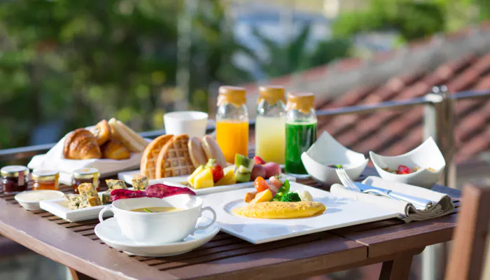 朝食はオールデイダイニング「グスク」でブッフェスタイルでお召し上がりいただけます。出迎えてくれるスタッフの笑顔と美味しい料理、豊かな眺望に抱かれながら、爽やかな朝を迎えられます。