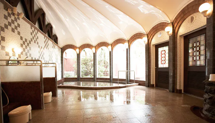 湯煙が立ち上がる雲仙の地獄温泉を源泉に用いた「硫黄泉浴室」は、九州のクラシックホテルならではの施設です。可愛らしいタイルやステンドグラスを用いた洋館のホテルにふさわしい造りは、思わず心ときめくことでしょう。
