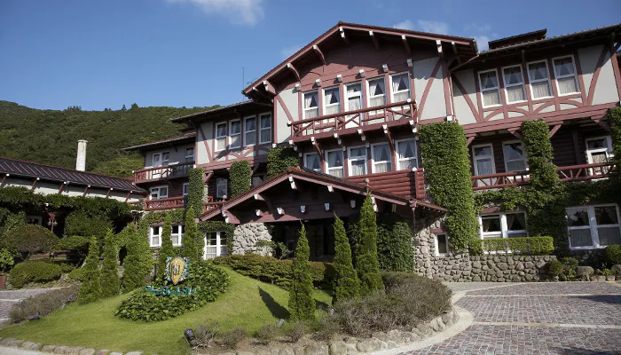 スイスの山岳地方に見られる「シャレー」と呼ばれる建築様式を取り入れた、赤い屋根が印象的な山小屋風のホテルは、登録有形文化財に登録され、近代化産業遺産にも認定されている、歴史的な建造物です。