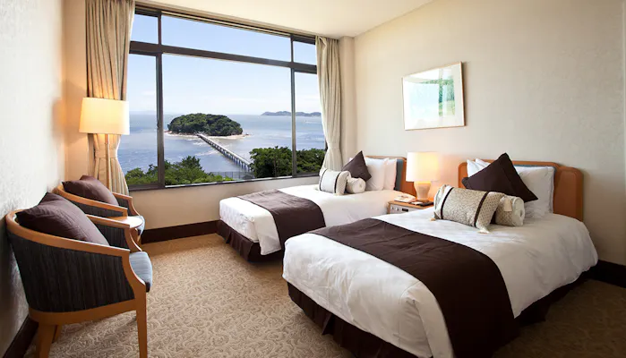 「三河湾と竹島を一望する【スイートルーム】」からは、国の天然記念物に指定されている竹島をはじめ、緑の島々を一望。夕暮れ時には半島の先に沈みゆく夕日が三河湾を赤く染め、竹島へと通じる橋にぼんやりと明かりが灯る光景は、息をのむ美しさです。