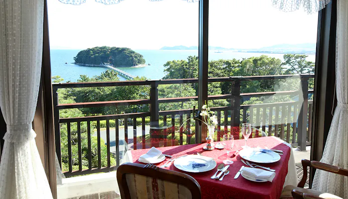 お食事はフレンチや鉄板焼き、会席料理など個性溢れる3つのレストランから選びましょう。70年以上の年月を経たモダニズムが感じられる「メインダイニングルーム」は、煌びやかな空間です。三河湾で獲れる新鮮な海の幸と特選和牛を取り入れた本格的なフランス料理を、ソムリエ厳選のワインと共にいただきましょう。竹島を眺めるテラス席での食事は、忘れえぬひとときになること請け合いです。