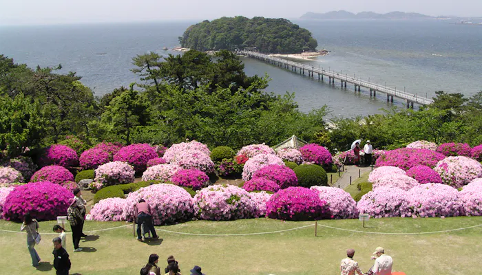 特に4月下旬から5月上旬にかけては「つつじまつり」が開催され、多くの人々でにぎわいます。赤や白、ピンクなど5種類、約3,000本のつつじが鮮やかに咲き誇る様子は、一見の価値あり。三河湾に浮かぶ竹島とのコントラストは、この時期この場所でしか出会うことのできない絶景です。