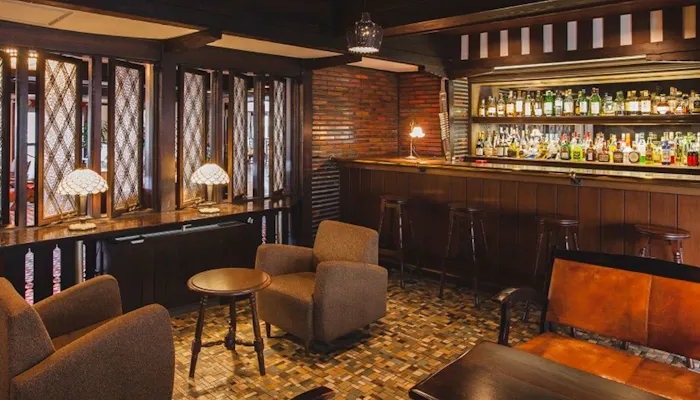 重厚感のある落ち着いた雰囲気が特徴的な「バー」はホテルの創業以来、長年の時を刻み続けている歴史ある場所。1枚1枚素焼きしたタイルが埋め込まれた床など、当時の職人の技が結集された空間は、目を見張るものがあります。