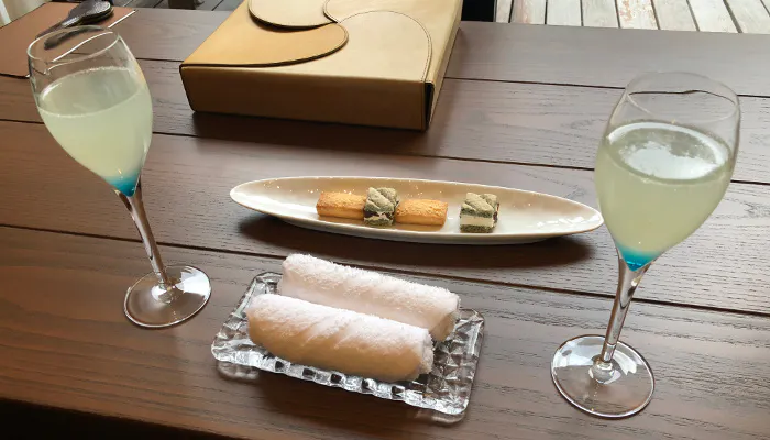 一通りお部屋を探索した後は、ソファーに座ってチェックインをしましょう。小菓子とウェルカムドリンクをいただきながら館内の説明を聞きます。甘い小菓子は移動の疲れを癒すため、塩味のある小菓子は湯上り後の塩分補給のために用意をされているそうです。そんな細やかなおもてなしの気持ちが嬉しいです。
