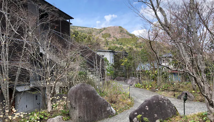 石畳の道が宿泊棟へ繋がります。訪れた時期が早く、木々はまだ蕾でしたが、自然の香りが心地良いです。春になると満開のお花、夏は緑が生い茂るそう。そんな彩りあふれた景色も見てみたいものです。