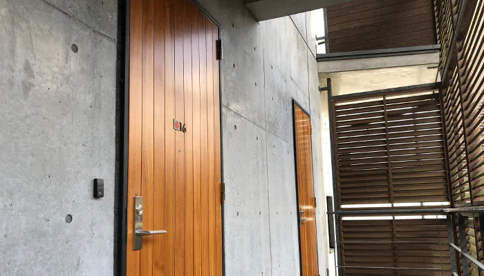今回宿泊したのは「リバーウイングスイート」。打ちっぱなしのコンクリートの建物に、温かみのある木の扉がセンスの良さを感じます。