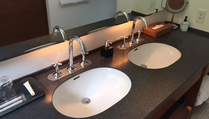 洗面台とお手洗いはベッドの奥にあります。今回宿泊したお部屋は、ダブルベイシンなので身支度の際に便利です。