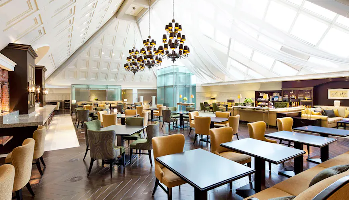 ホテルの最上階、東京駅丸の内駅舎の中央・大屋根裏にあるのは、ゲストラウンジ「アトリウム」。東京駅丸の内駅舎の保存・復原工事によって生まれた400平米を超えるスペースで、最大9メートルという高い天井が開放感たっぷり。創建当時のレンガ構造が受け継がれた空間では、朝食やディナーをいただくことができます。特に評判の朝食は、人気のブッフェスタイル。新鮮な野菜をはじめ、手の込んだ魚や肉料理、ライブステーションで作られる卵料理など、100種類以上のアイテムが並びます。厳選食材を使用したメニューで、優雅なモーニングタイムを過ごしてみて。