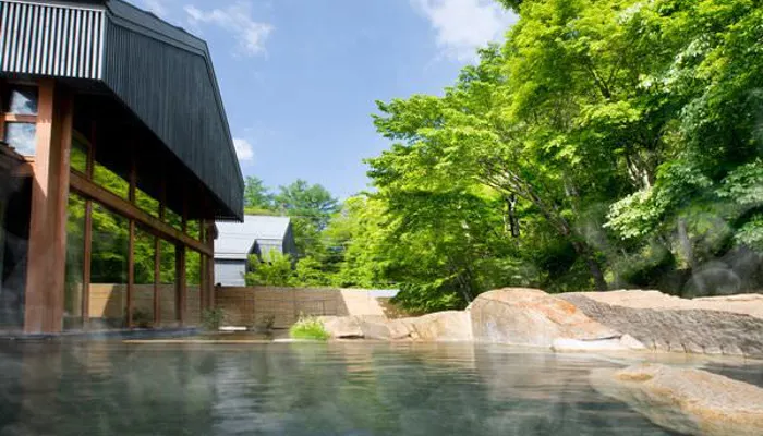 ホテルの宿泊者は、「星野温泉トンボの湯」を自由に利用可能。ヒノキが香る内湯と、巨大な花崗岩に囲まれた露天風呂。どちらでも山裾に広がる自然を眺めながら、湯の花が浮かぶ良質な温泉を堪能できます。自然の恵みを全身に感じれば、日頃の疲れもいつの間にか解きほぐれていくことでしょう。