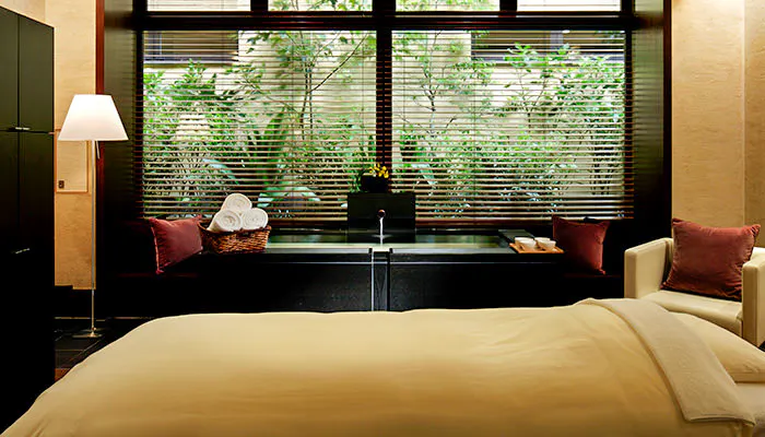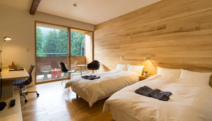 レセプション棟の重厚で落ち着いた雰囲気に対し、客室は清々しい白木を多用し、癒しと安らぎを感じられます。シンプルな客室に大きな机とチャールズ&レイ・イームズの「アルミナムチェア」を配した「クリエイターズ・ツイン」は、ゆっくりと読書をして過ごしたり、アイディアを考えるなどの作業をしたりするのにもおすすめです。