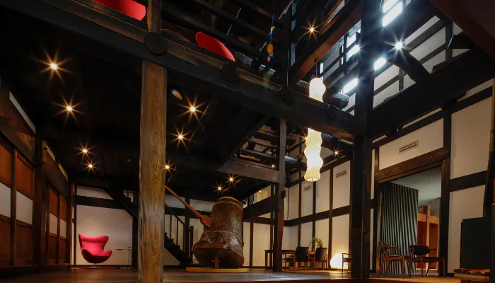 「里山十帖」の最寄り駅、大沢駅までは東京駅から電車で約1時間40分。大沢駅からは宿の送迎車で向かいます。築150年の古民家を改修したレセプション棟は、梁や柱を活かした開放的な空間にモダンな家具を配置。ラウンジでは、好みのデザイナーズチェアに座ってコーヒーやお酒をいただきましょう。