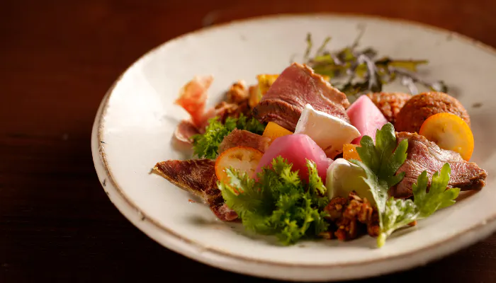 築150年の古民家でいただく夕食は、伝統を大切にしながらもジャンルにとらわれない「自然派 日本料理」。オーガニック野菜を引き立てるために、だしと天然醸造調味料にこだわっています。新潟と言えば日本酒。魚沼の銘柄と中心としたお酒をはじめ、20種類以上の自然派ワインも取り揃え、美食とのマリアージュを楽しめます。