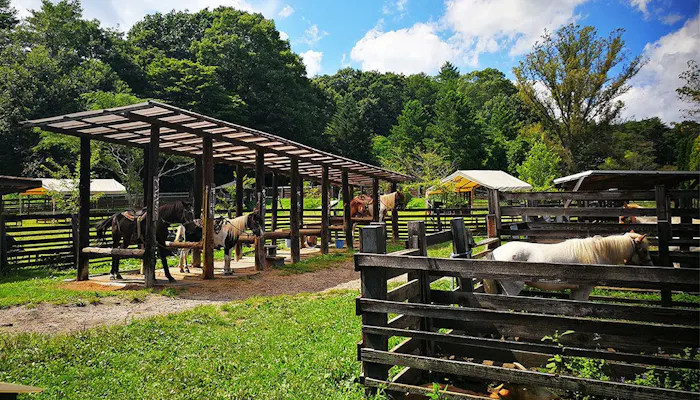 乗馬教室では、体験レッスンからスクールまで様々なレベルに合わせたレッスンを提供。限られた時間の中で、馬の歩かせ方、止め方、曲がり方などを学び、さらに山の中で馬と散策できるプランもあります。豊かな森林と雄大な山々に囲まれたエリアで、自然を満喫しながら乗馬をすれば日頃のストレスも解消されそうですね。