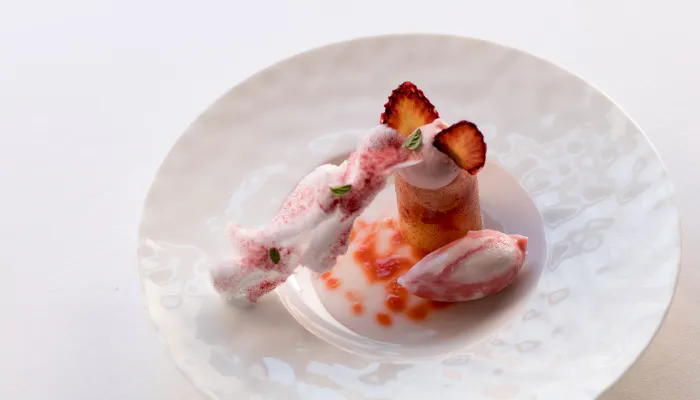 お待ちかねのデザートは2種類。静岡生まれで今が旬の紅ほっぺとミントのさっぱりとした風味が特徴の一品、柑橘とショコラ、キャラメルを用いた甘さが引き立つメニューが続きます。