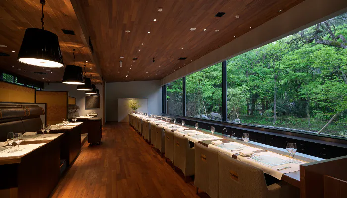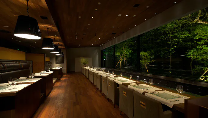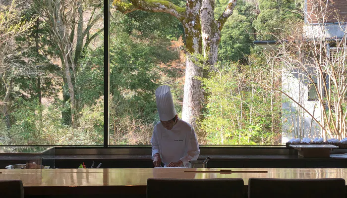 大きな窓から見える神秘的な楠木を背景、料理人が演者に、まるで一つの舞台を鑑賞しているかのよう。キッチンの目の前に「カウンター席」、その後ろに一段高く「オペラシート」が配され、どこの席からも景色を一望できます。