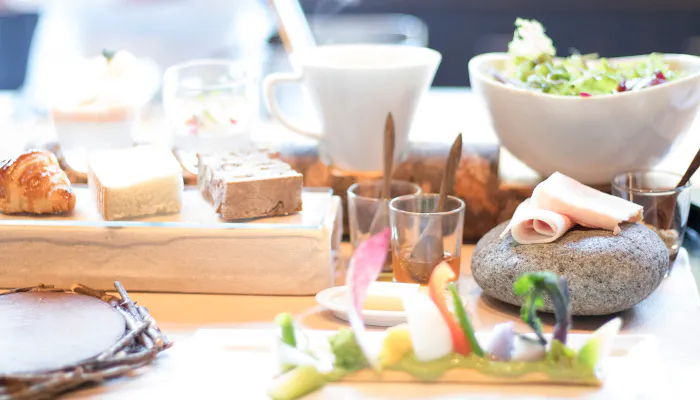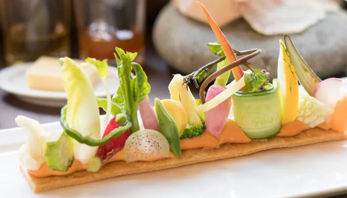 頭が冴えてきたところで、食事が運ばれてきます。「森の中のピクニック」というテーマの朝食は、木を使った器や白いシンプルなお皿に、野に咲く花々を連想させるカラフルな野菜が華を添えるメニューです。