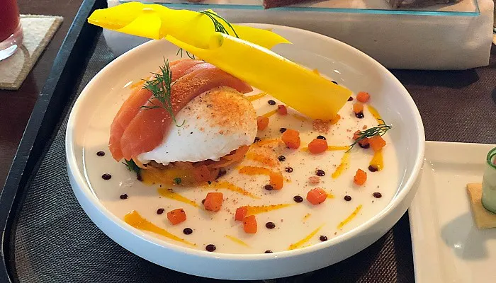 卵料理は5種類の調理方法と4種類の素材をかけ合わせた、20種類の中から選べます。私は「ポーチドエッグ」×「サーモン・人参」をチョイス。