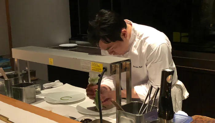 「arcana izuの広いカウンター席だからこそ、横幅の大きな器での盛り付けができるんです。」と糸井シェフ。