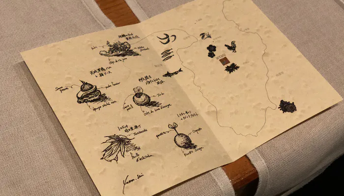 調理に使われた食材が、伊豆のどこで採れたかを紹介するイラストを見ながらいただきます。この可愛らしいイラストもシェフが描いたもの。