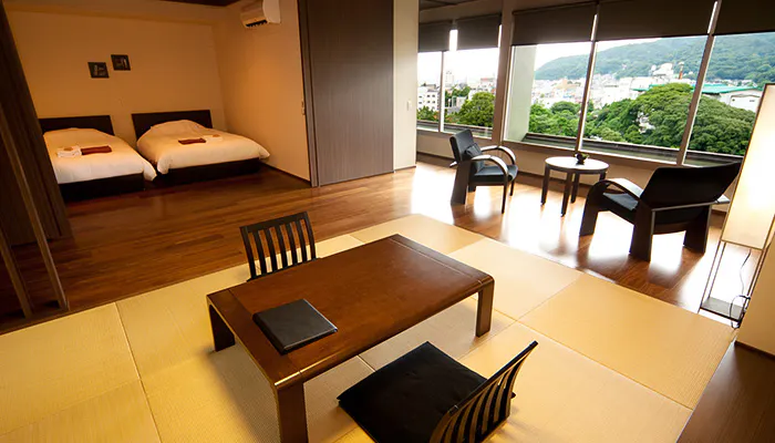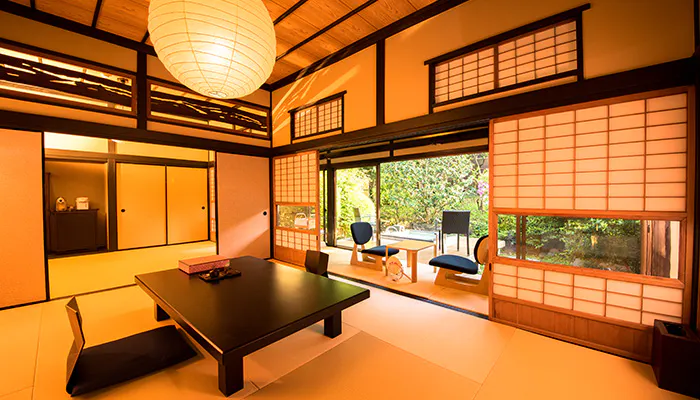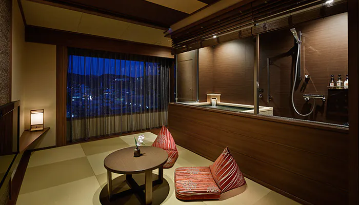 「温泉付きプレミアルーム」でも、自家源泉をひいたお湯がたっぷりと注がれています。靴を脱いでゆったりと足を伸ばせる畳敷きは、落ち着いて過ごせる心地良い空間です。