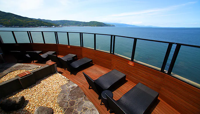 「ラグジュアリー 和 ホテル 風の薫UMI」は、打ち寄せる波を間近に感じられるロケーション。中でも「空中庭園」は館内随一の絶景スポットで、地上30mから移り変わる相模湾の景色を楽しめます。