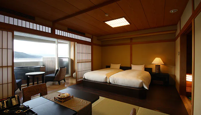お部屋は全室角部屋のオーシャンビューで、檜の内風呂と信楽焼の露天風呂を設えた贅沢な造り。マッサージチェアもあり、自宅のような空間でくつろぎのリラックスタイムを過ごしましょう。