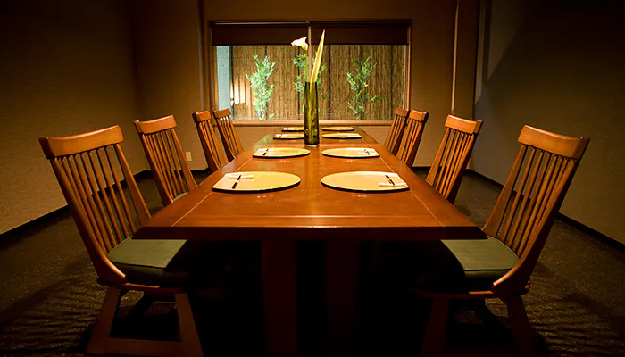 食事は全室個室のプライベートダイニングで。旬や地元ならではの食材にこだわった料理の数々はガラスや和洋食器の上に色鮮やかに盛り付けられ、目でも舌でも美食の世界へ誘われることでしょう。