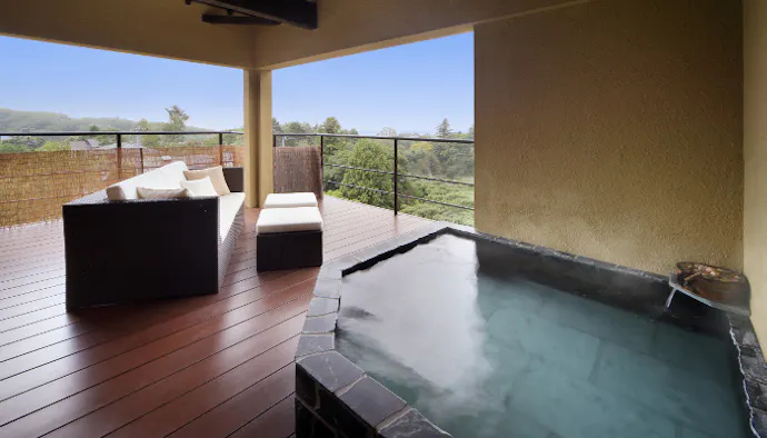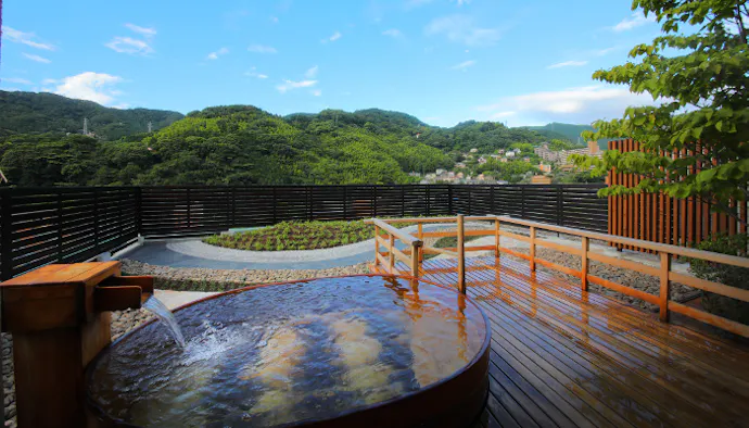 親子で楽しみたい宿の湯めぐりの中でも、楕円型の湯船が特徴的な3階の貸切露天風呂は、湯河原の山々を見渡す開放的なロケーションが魅力です。小さい子供向けのおもちゃを準備してくれるのも嬉しいところ。利用の際は予約をして、心地良い景色の中で家族水入らずの素敵なひとときを過ごしてみては。