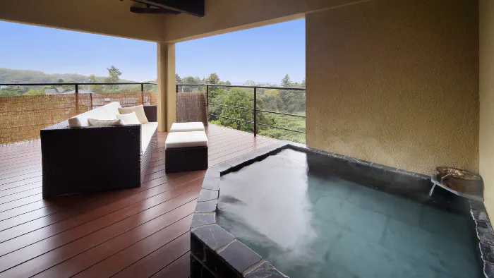 客室には、琉球畳を配した和室の先にソファを設えたテラスと露天風呂を完備。晴れていれば伊豆大島を望みながらの湯浴みができます。露天風呂からも子供の寝ている姿が見える構造になっているため、入浴中も安心ですね。子供ステイに特化した施設ならではのサポートで、快適な子連れ旅行を満喫しましょう。