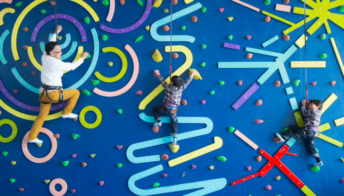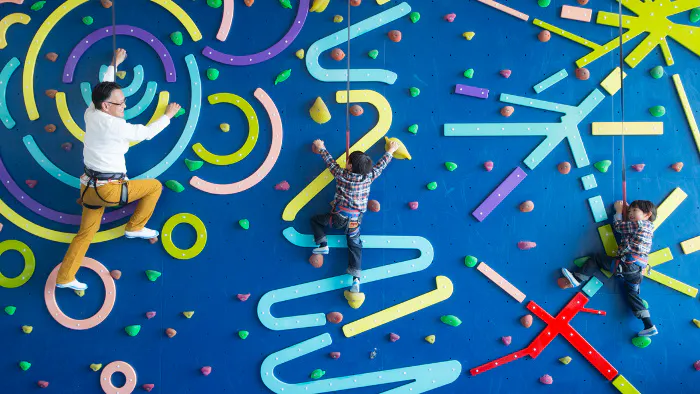 JR熱海駅から車で20分程の熱海の山上に建つ「リゾナーレ熱海」は、絶景が魅力のリゾートホテル。子供も大人も思う存分楽しめるアクティビティが満載です。館内には、高さ6.5メートルの巨大クライミングウォールが。花火をイメージしたデザインと海洋生物をモチーフにしたホールドで、親子でクライミングにチャレンジができます。