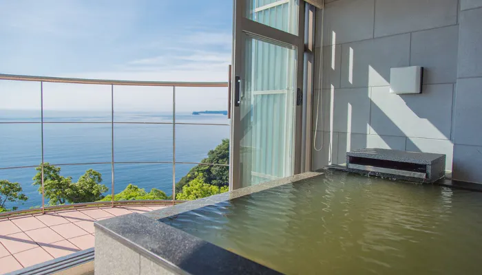 「ホテルふたり木もれ陽」は、都心から最短60分で行ける好アクセスの宿。目を見張るほどのオーシャンビューに圧倒させられます。全ての客室に源泉掛け流しの露天風呂を完備しており、プライベートな湯浴みに日ごろの疲れも吹き飛びます。