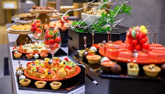 ブッフェスタイルの食事では、地の物をふんだんに使った料理が並びます。デザートコーナーが充実しているのも嬉しいところ。オリジナルスイーツは、二十四節気の折々をテーマに全て手作りです。