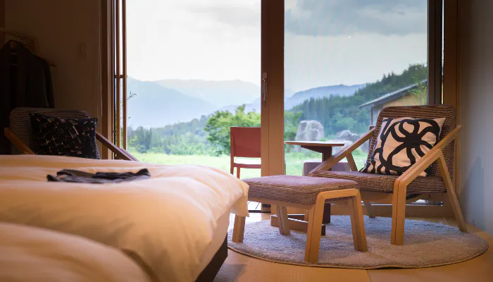 「里山十帖」は東京駅から上越新幹線で約1時間半、最寄り駅から無料の送迎もあるので、お母さんとの旅でも安心。北欧家具が配されたお洒落な客室は、使い勝手の良さが嬉しいです。