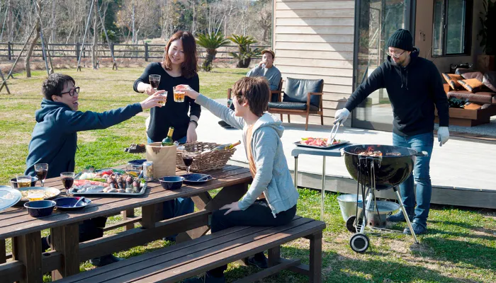 天気のいい日には、みんなでワイワイとバーベキューを。器材や食材などは用意されているので、手ぶらで大丈夫です。1棟貸しならではの自由度の高さが、友達との旅に持ってこいですね。