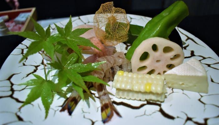まずは、先付を。器も華やかで素敵です。一緒にいただいたドリンクは、自家製「赤紫蘇のスパークリングティー」です。甘酸っぱくて、喉越しがよく、今の季節にピッタリでした。