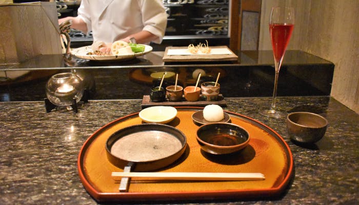 今回は、「ミシュランガイド 京都・大阪 2018」において、料理の格付けで一つ星を獲得した、天麩羅 水暉で夕食をいただきました。重厚な御影石のカウンターにシートを設けた割烹スタイルで、少し奥まったところにあり、隠れ家的な感じでした。