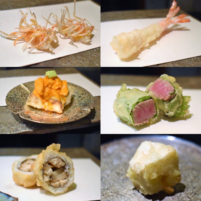 車海老、トウモロコシ、近江牛フィレの紫蘇巻、賀茂茄子と雲丹、鱧と松茸、カマンベールチーズなど約10種類ほどの食材を、タイミングよく揚げて出してくださいます。紅花油を使って揚げているそうですが、とにかくサクッとしていて、全く脂っこくない! 普段、揚げ物は、そんなに数多く食べられないので、実はこの日も「控えめで…」とお伝えしていたのですが、まだまだいくつでも食べられますと言ってしまうほどでした。
