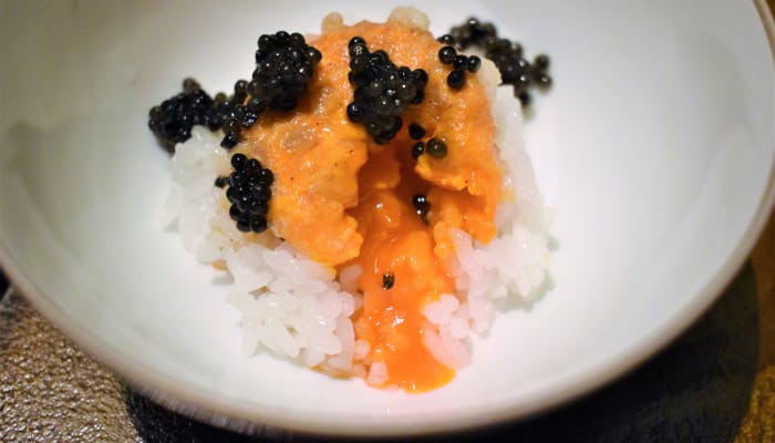 〆のご飯は、シグネチャーメニューの山梨県中村農場産ハーブ卵を使った卵黄の天麩羅御飯キャビアのせ。