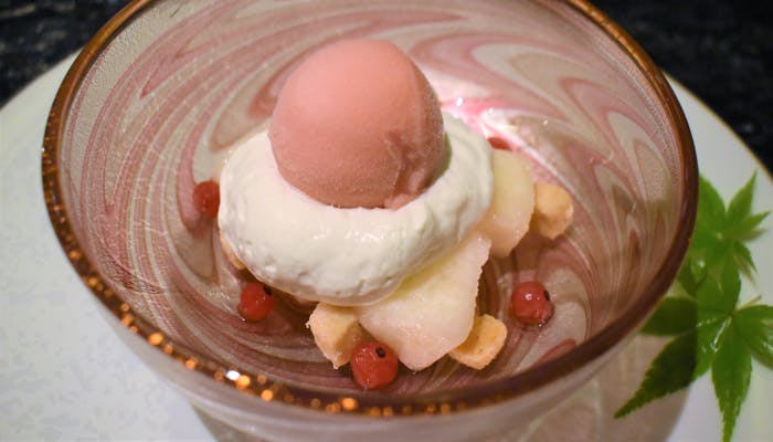 最後は、ピエール・エルメ・パリのデザートをいただきました。桃とすぐりが入った、さっぱりしたデザートで、生クリームが苦手な私でも最後までいただけました。