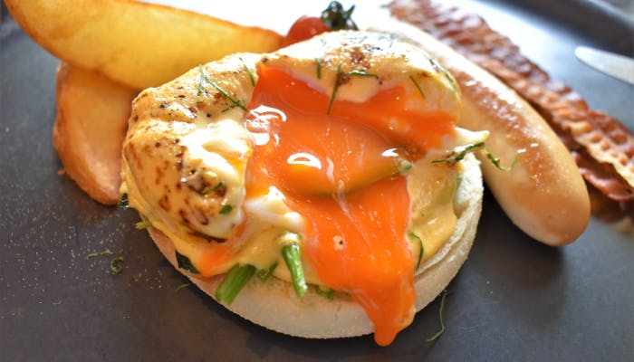 ドロ~ンと弾力がある黄身は濃厚で、イングリッシュマフィンとの相性はもちろん、付け合わせのポテトやソーセージと一緒にいただいても。