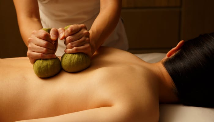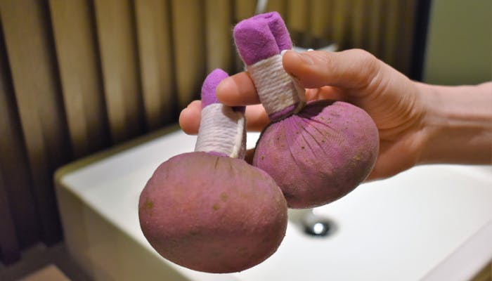 私が体験したメニュー「RYOKUCHA SERENITY RITUAL」は、ザ・リッツ・カールトン京都のシグネチャートリートメント。はじめに宇治茶に浸し温めたハーブボールで全身の血行を促進し、老廃物を浄化します。