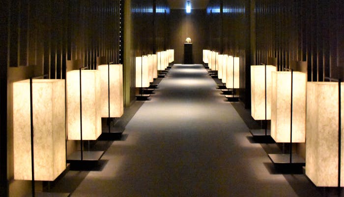客室フロアからエレベーターを降り、モダンで現代的な格子戸のデザインが素敵な廊下を進みます。エントランスまでの距離が長ければ長いほど、期待感が膨らみますね。