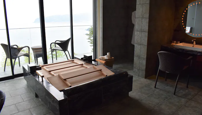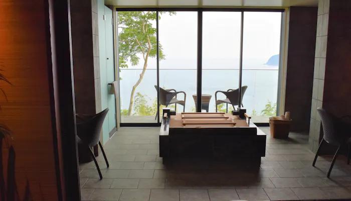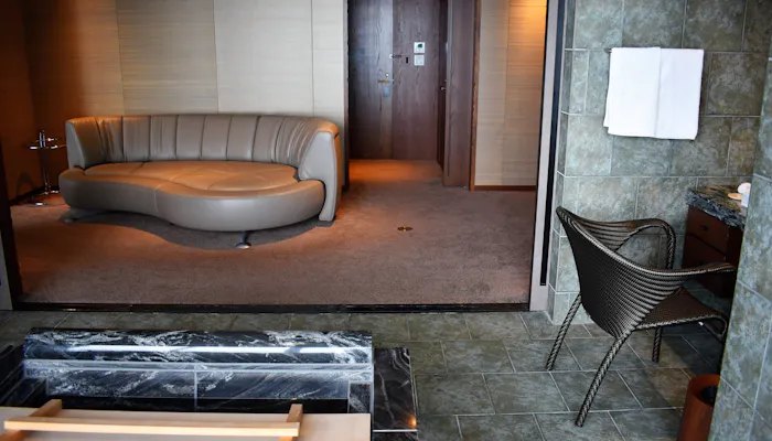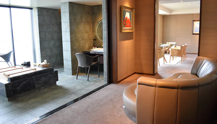 ソファーのあるリビングルームとバスルームの間には仕切りがありますので、友人同士の旅でも気を遣うことなく、温泉に入ることができます。